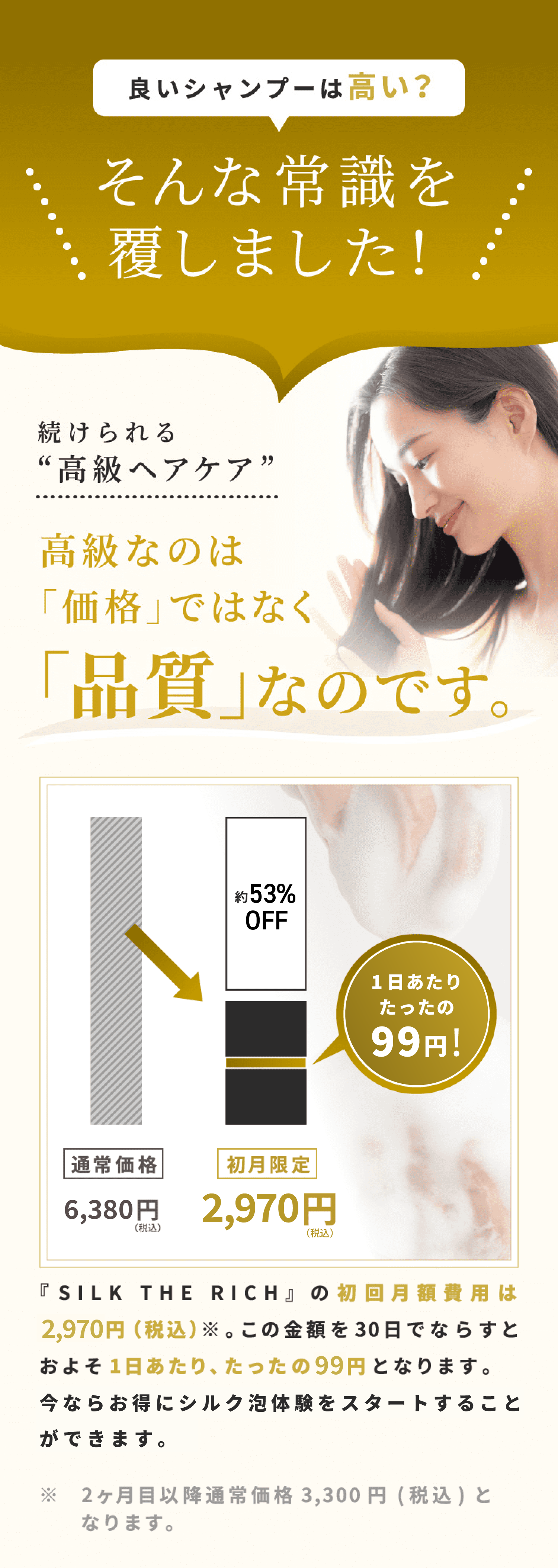 ※2カ月目以降はシャンプー・トリートメントの詰め替えパウチを3,300円(税込)+送料250円でお送りします。初回特典のヘアオイルはつきません。